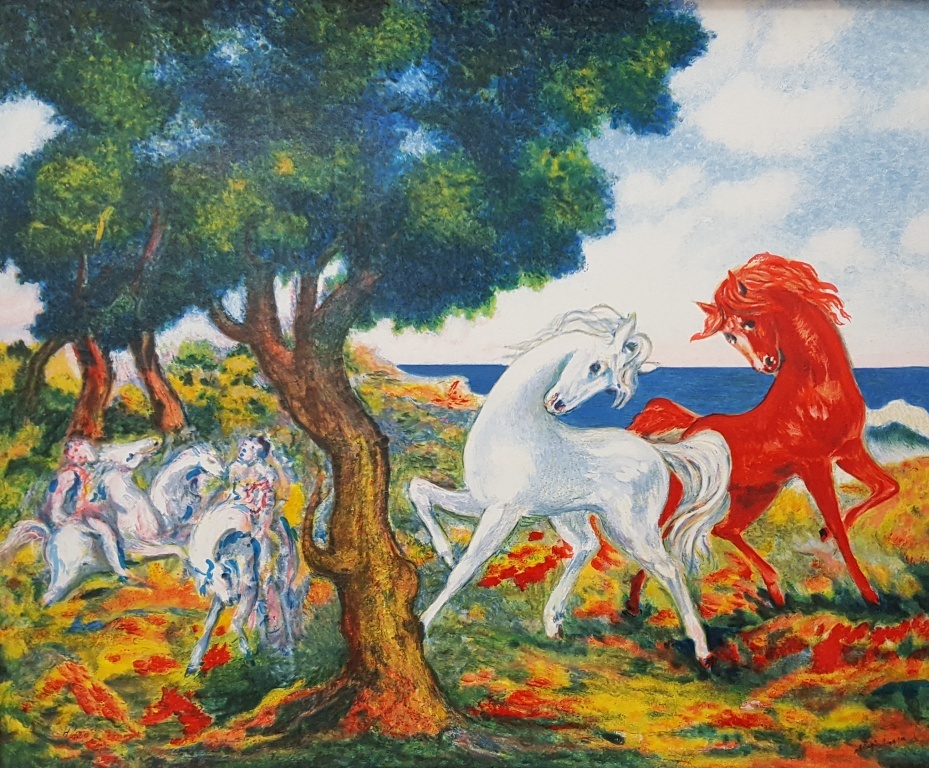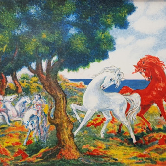 Aligi Sassu (Milano, 1912 – Pollença, 2000). Molto vicino al movimento futurista, membro del gruppo di Corrente e convinto antifascista. Artista versatile e in continua evoluzione, ogni periodo creativo è influenzato dai cambiamenti della realtà che lo circonda. I protagonisti delle sue opere mutano nel corso del tempo: dai celebri Uomini rossi, ai cavalli, figure mitologiche, soggetti sacri, i ricordi dei Caffè di Parigi, le tauromachie. Si accosta all’arte futurista fin da piccolo: grazie alle conoscenze del padre, entra in contatto con Carrà, Boccioni, Marinetti, e nel 1928 scrive il Manifesto della Pittura “Dinamismo e riforma muscolare” col designer Bruno Munari. Aderisce al primitivismo studiando Beato Angelico e Masolino da Panicale;