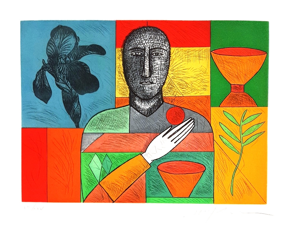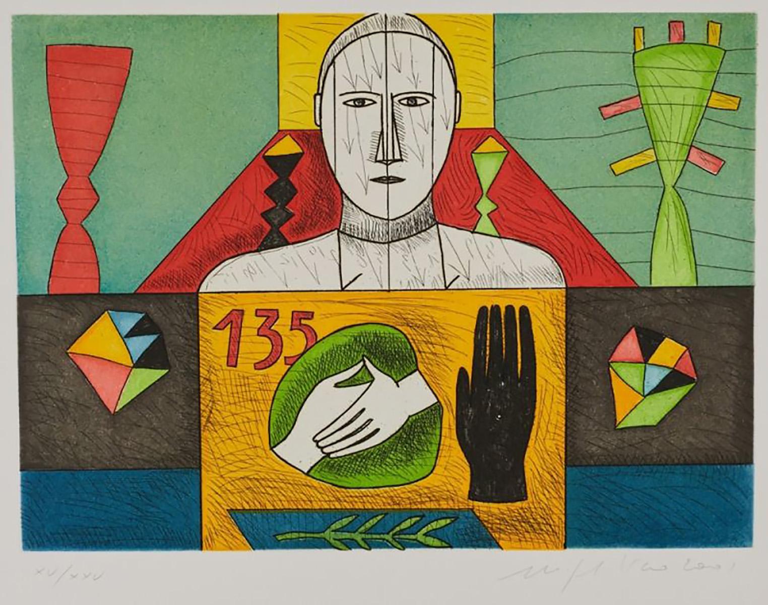 Mimmo Paladino (Paduli, 1948). Dal 1964 al 1969, studia presso il Liceo artistico della sua città natale. Durante gli anni ’70, l’artista lavora con delle foto in maniera “post concettuale”, lavoro che abbandona poco a poco per volgersi verso un’arte figurativa più espressiva. La sua prima esposizione personale viene organizzata nel 1976. Nel 1980, Paladino è fondatore con altri artisti del movimento della Transavanguardia italiana. Nello stesso anno partecipa alla Biennale di Venezia con il medesimo gruppo. Durante gli anni ’80, Mimmo Paladino realizza delle tele molto colorate in cui ritroviamo “l’iconografia della nostra cultura”; l’artista dipinge strani animali, dei personaggi ibridi e distorti.